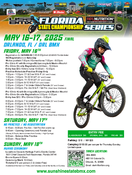 Camping: $150.00 per camper for Thursday through Sunday. Limited spaceFriday, May 16thRegistration for SATURDAY: 2:30-6:30pm at USABMX Florida trailerFriday Only - No Registration on SaturdayMotos posted: 7:00pmCorrections: 7:00pm - 8:00pmPro Clinic #1 with Domingos DL Lammoglia & Weston Meurlot9:00am - 10:00am: Pro Clinic On-site Registration / Entry fee: $5010:00am - 12:30pm: Pro ClinicPractice Schedule: Practice Friday Only1:00pm - 1:20pm: 21 & Over M & /F (20” and Cruiser)1:20pm - 1:40pm: 14-20 M & F (20” and Cruiser)1:40pm - 2:00pm: 11-13 M & F (20” and Cruiser)2:00pm - 2:20pm: 8-10 M & F (20” and Cruiser)2:20pm - 2:40pm: 7 & Under Male & Female (20” and Cruiser)2:40pm - 3:00pm: Pro Am M & F / Vet Pro (Must Have Wristband)